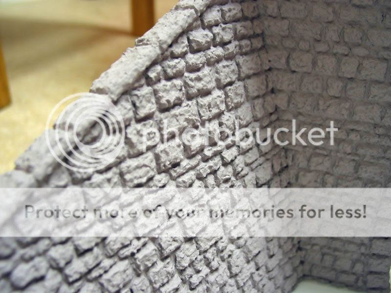 Toevallig zag ik in de kunstwinkel een zak Celluclay. Ik had in enkele oude modelbouwtijdschriften gelezen dat dat product vaak werd gebruikt om een ondergrond mee te maken. Als eerste experiment smeerde ik het papje uit op een stuk plastiek om na droging in steentjes te snijden, maar dat ging niet.  Na droging begon de Celluclay op te krullen en was veel te hard om nog gemakkelijk te kunnen snijden.