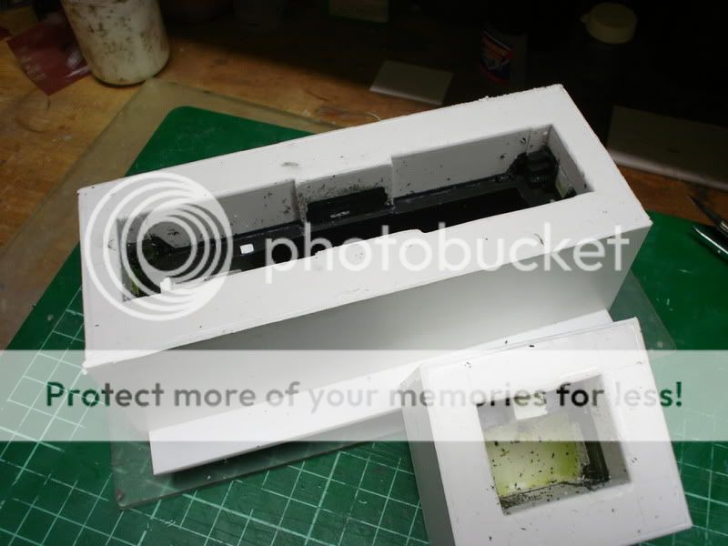 Eindelijk, de kist en de cabine stevig op hun basis kleven. Ik kleef met sythetische thinner, sinds en geen trichlo meer is...