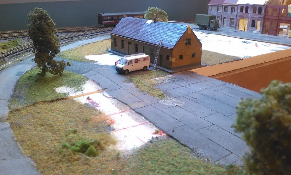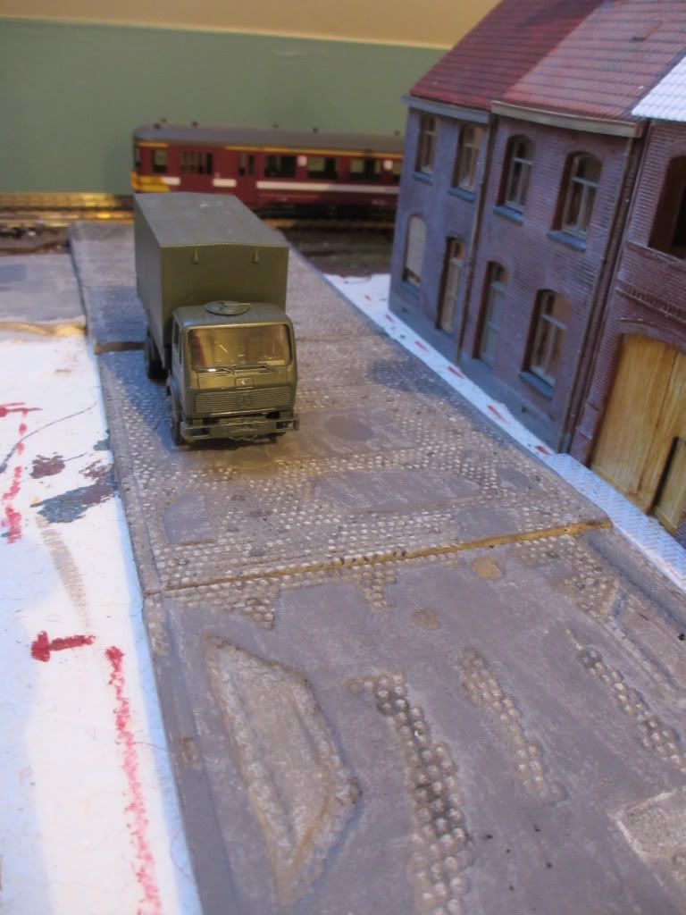 Ook de straat in architectenkarton is goed geslaagd, stukken kasseien, met tarmac en verzakkingen en stuk beton aan de bushalte...
