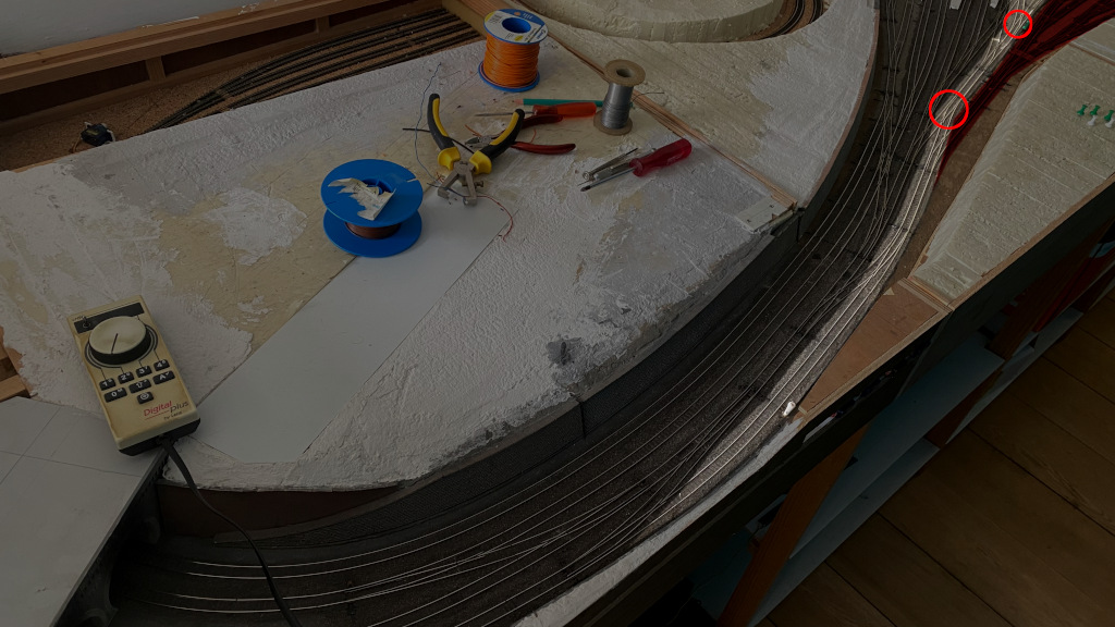 Het rijpad dat geactiveerd wordt, is het rechter spoor op de foto dat opgelicht is. Door de aansluting van de twee wissels in de rode circels kan dit rijpad bereden worden. Dit rijpad ontsluit de depotsporen en verbindt het met het uittrekspoor (het onderste spoor van de 4 onderaan op de foto). Veel depot is er niet (twee naderingssporen en een draaischijf) maar dit is de eerste stap om het depot ook op te nemen in het actief bedrijf. De zone in donkerrood (rechtsboven op de foto) zijn nog niet aangesloten. Dit zijn de sporen die leiden naar de 9 sporen van de opstelbundel.