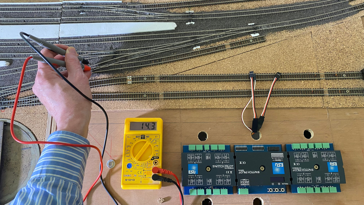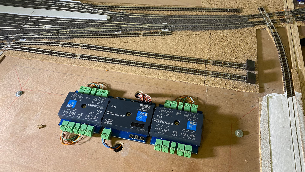 Er is weer spanning op de sporen, en bezetmelders melden ook terug. Dat is dus weer een stap in de goede richting. En nu waar het om ging: de wissels. Dat wilt zeggen het aansluiten van de SwitchPilot module, de servomotoren en puntstukken, en daarna kunnen we alles gaan afregelen. Het einde van de tunnel is in zicht.