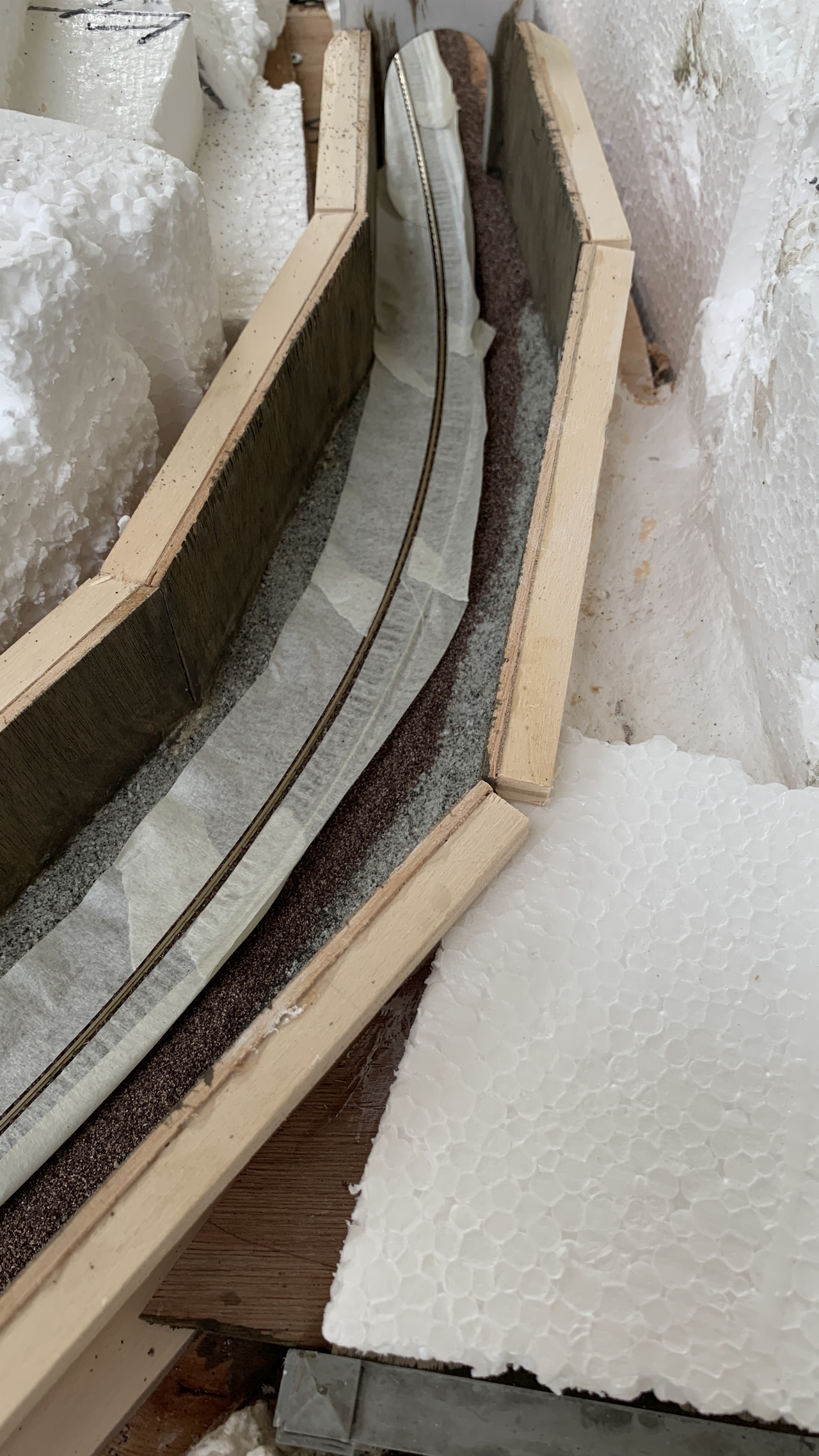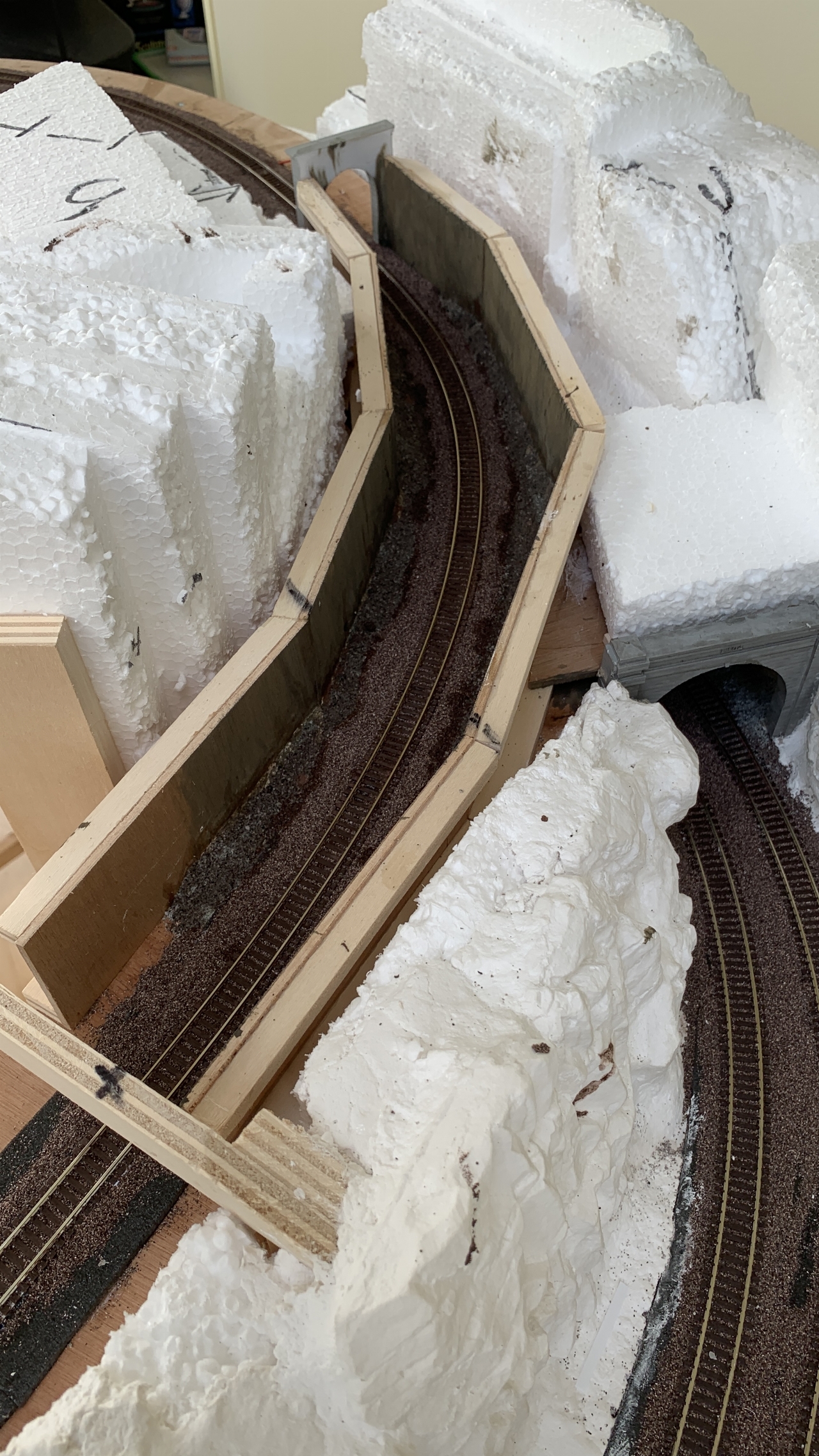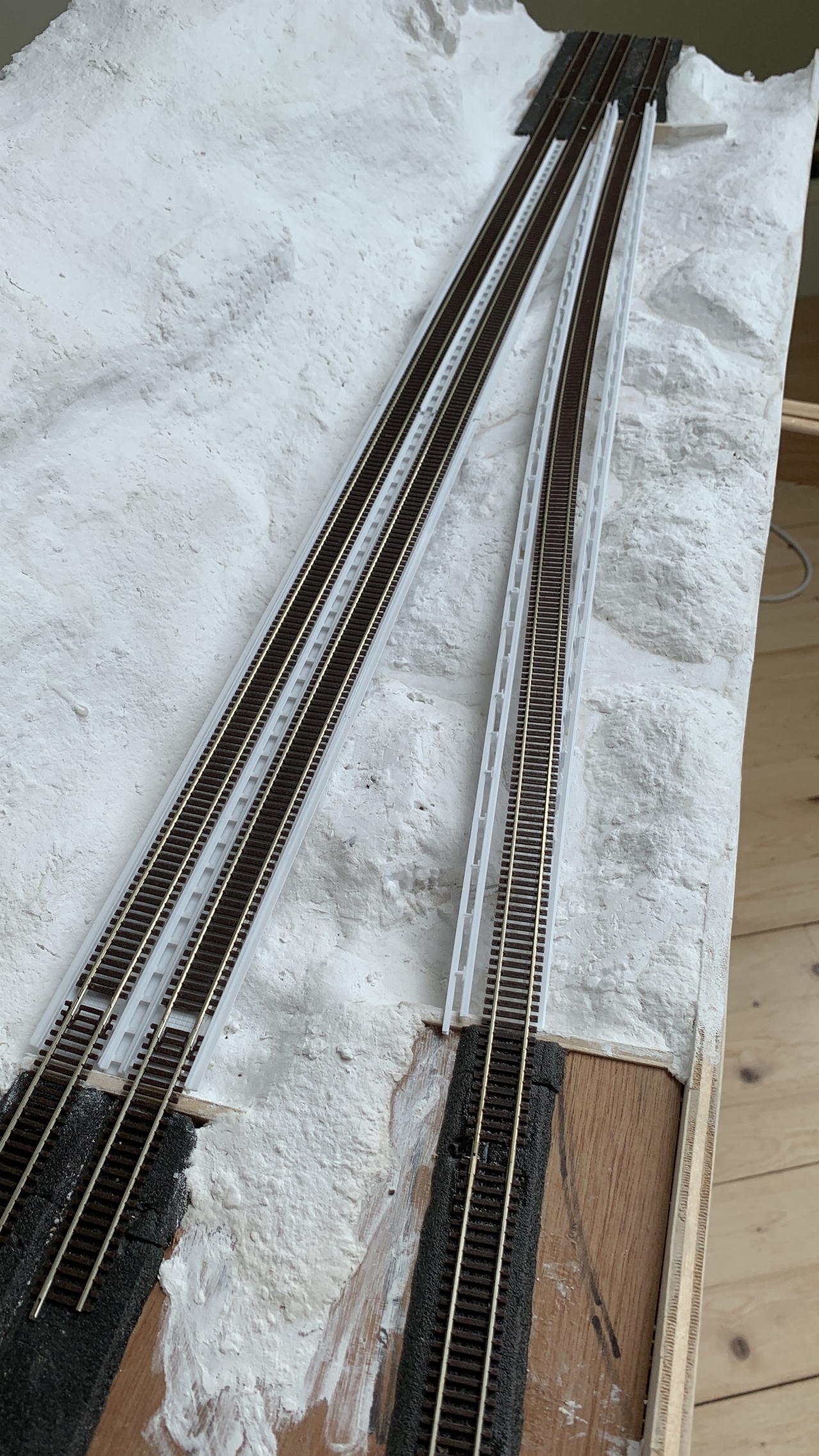 Fingers crossed ;) De tweesporige tunnel is slechts 50 cm lang. Van beide kanten kan ik erbij. In de tunnel zelf liggen twee flex-rails naast elkaar, dus geen lasjes. De aansluitpunten liggen aan beide zijden van de tunnel. Voor de enkelsporige tunnel geldt hetzelfde. In de achterwand komen sleuven waardoor ik bij de rest van deze tunnel kan komen. Ook de hellingbaan blijft toegankelijk via de achterwand. Alleen hopen dat de rails niet loskomt van de ondergrond. Zie net dat twee identieke gipsvormen boven elkaar liggen. Nadat alles is uitgehard ga ik met een beiteltje alle rotsen nog bijwerken.