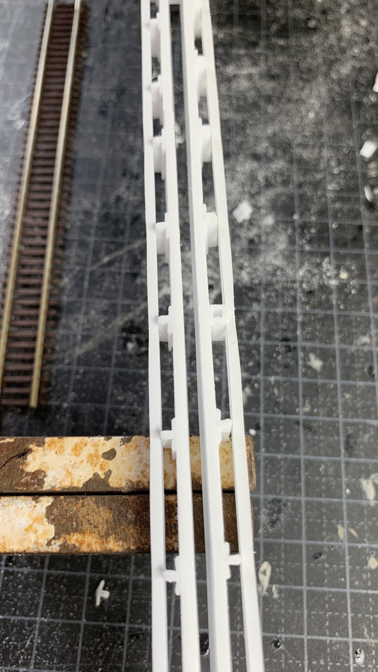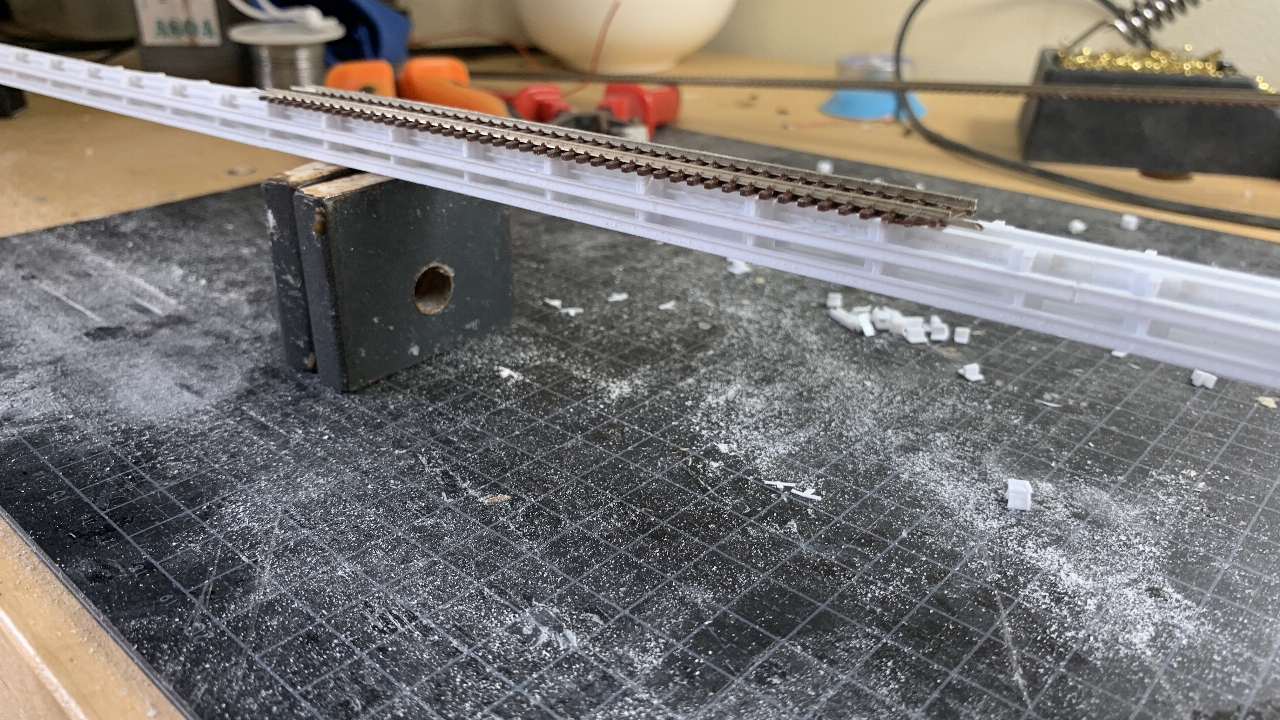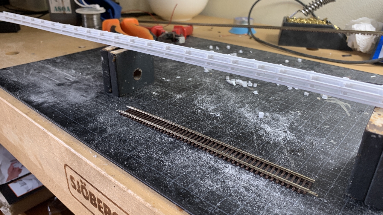 Nu de rails. Alles gaat bij mij nooit de eerste keer goed. Bij het installeren van de wissels ging het alweer fout. Het geboorde gat voor de draad van de servo was weer eens te groot.