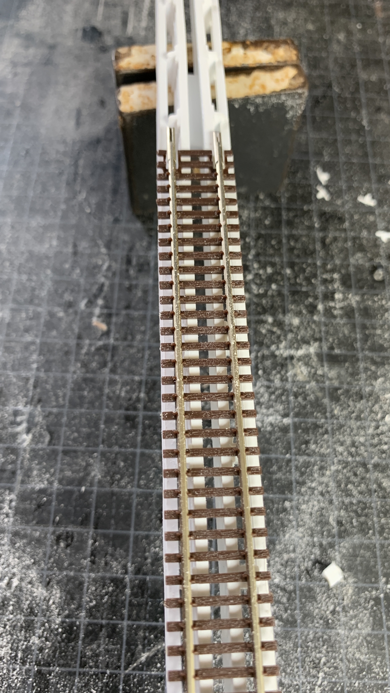 Bij het vastlijmen van de rails, bleek er een geforceerde knik in het verloop van de rails te liggen, juist bij een overgang naar een brug. Toen heb ik de rails aan de beide bruggenhoofden tijdelijk vastgelijmd en met een flexrail tussen beide bruggenhoofden, door een beetje spanning op de rail te zetten, deze het verloop van het tracé laten bepalen.