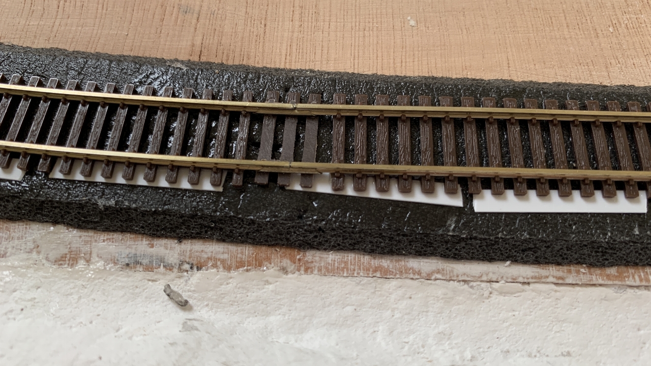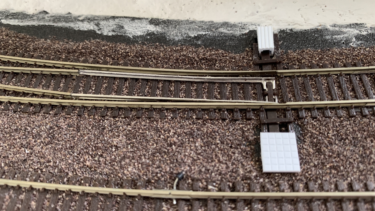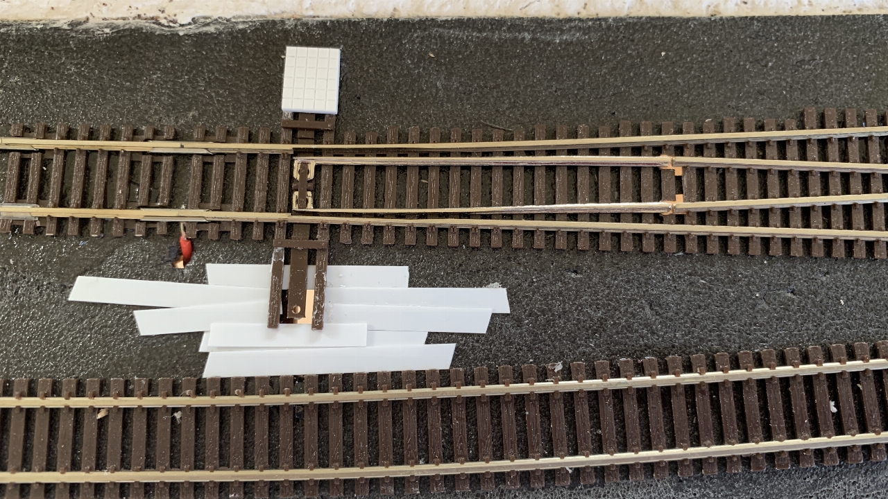 Dit maar geprobeerd af te dekken met heel, dunne strips.Toen kwam weer het volgende probleem. Deze wissels zijn van het merk Atlas. De stelbalk voor het omzetten van de wissels loopt aan beide kanten door onder de bielzen. Een kant afkorten kan niet omdat de wissel niet meer soepel omgaat. De lip voor de servodraad ligt losjes. Voor de bedrijfszekerheid heb ik aan de losse kant een plaatje gelijmd. Aan de kant van de servodraad komt een hulsje. Uiteindelijk functioneert de wissel zonder storingen. Nu nog de boel camoufleren.