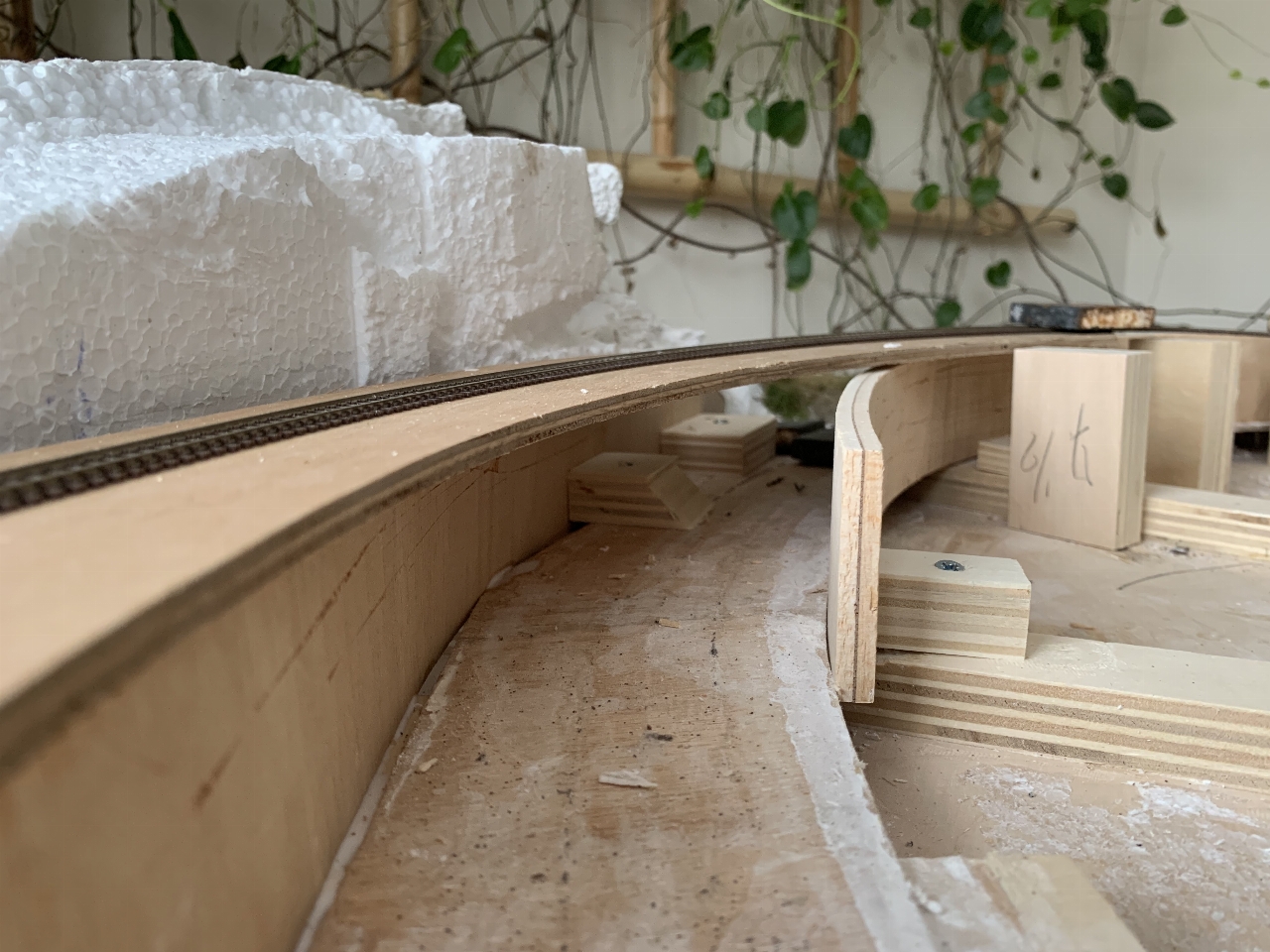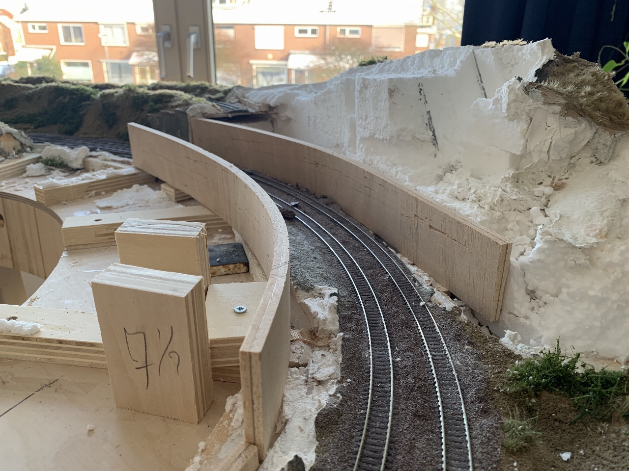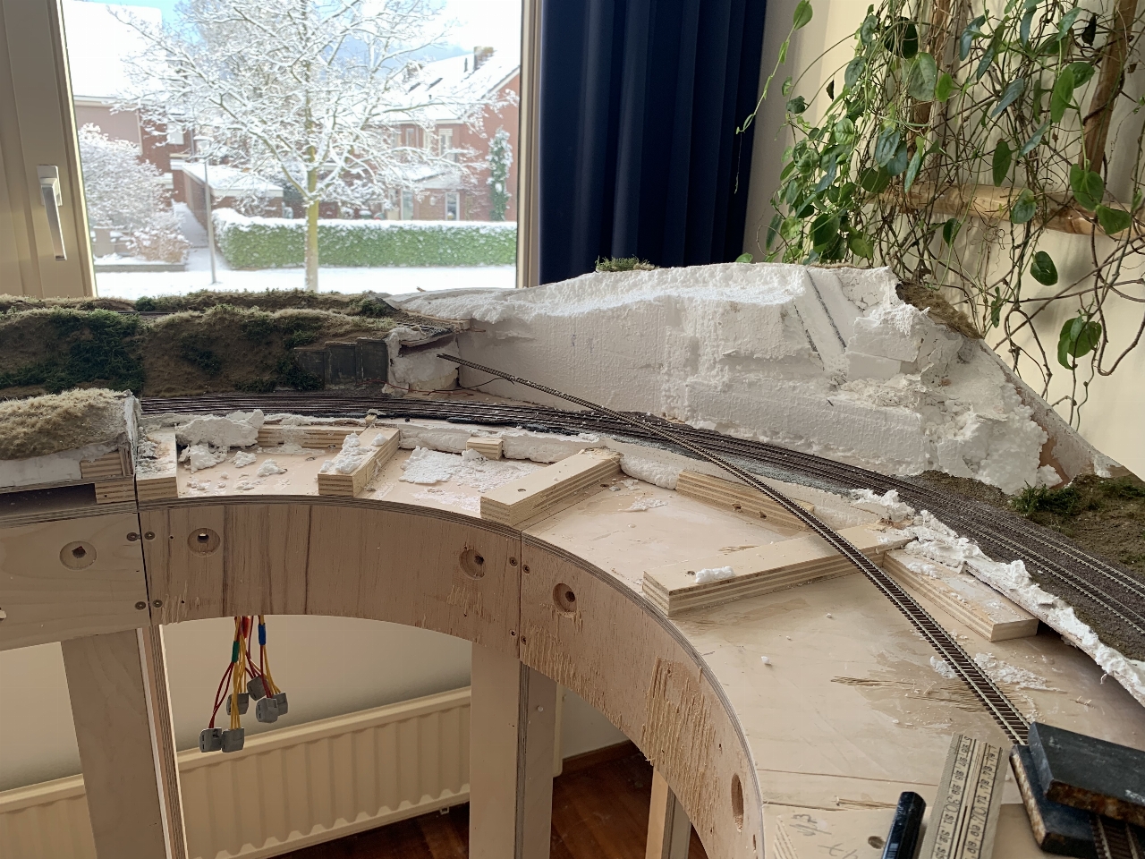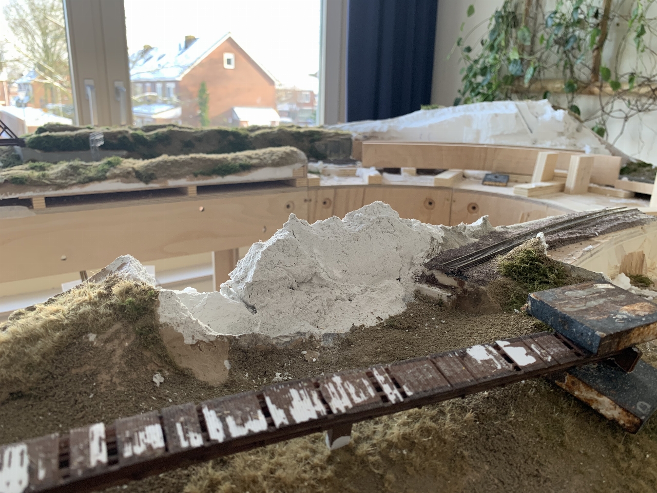 Bij nader inzien heb ik de heuvels op de boogmodule eveneens gesloopt. De straal van de boog van de rails bleek toch weer aan de krappe kant. Het landschap wordt waarschijnlijk veel vlakker. Nu komt de railbedding dichter tegen het bestaande spoor aan te liggen.