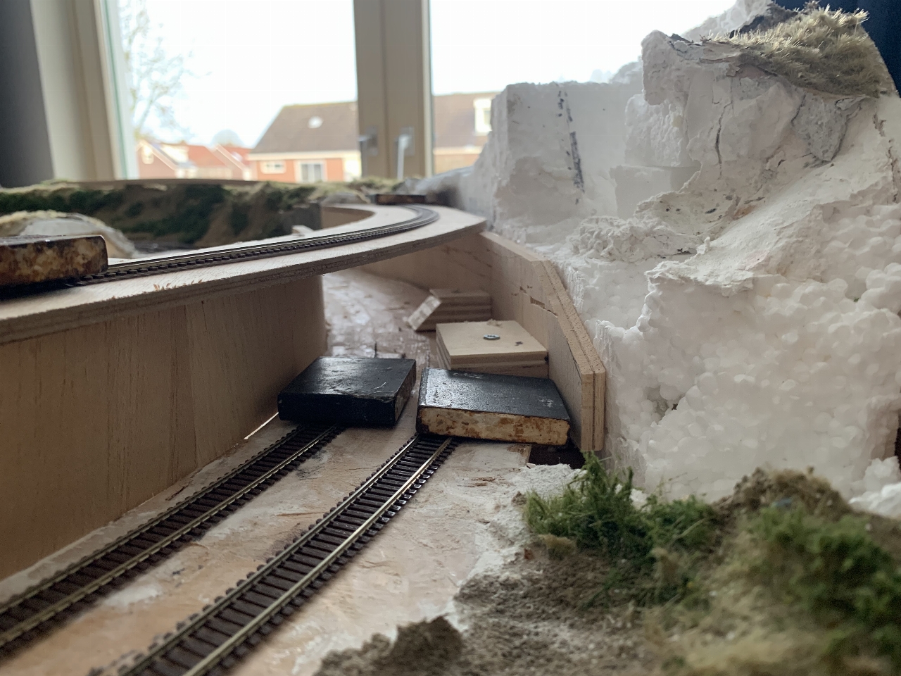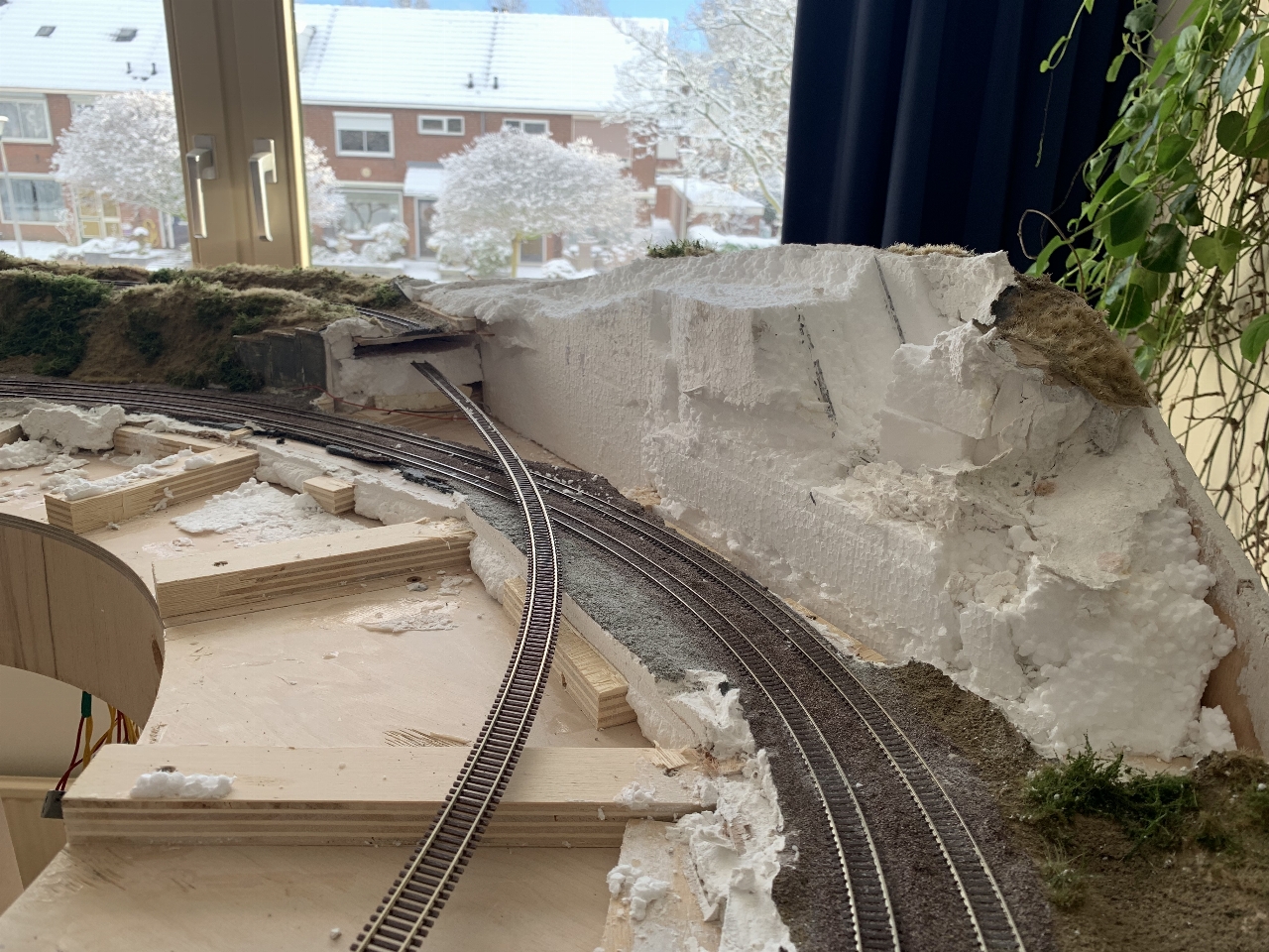 Na veel breekwerk, heb ik nu weer een solide basis voor het ballastbed en het landschap op dit deel van de modelbaan. Sommige rotsen heb ik kunnen sparen. De gesloopte rotsdelen heb ik kunnen inpassen in het landschap. Alles staat provisorisch op z'n plek.