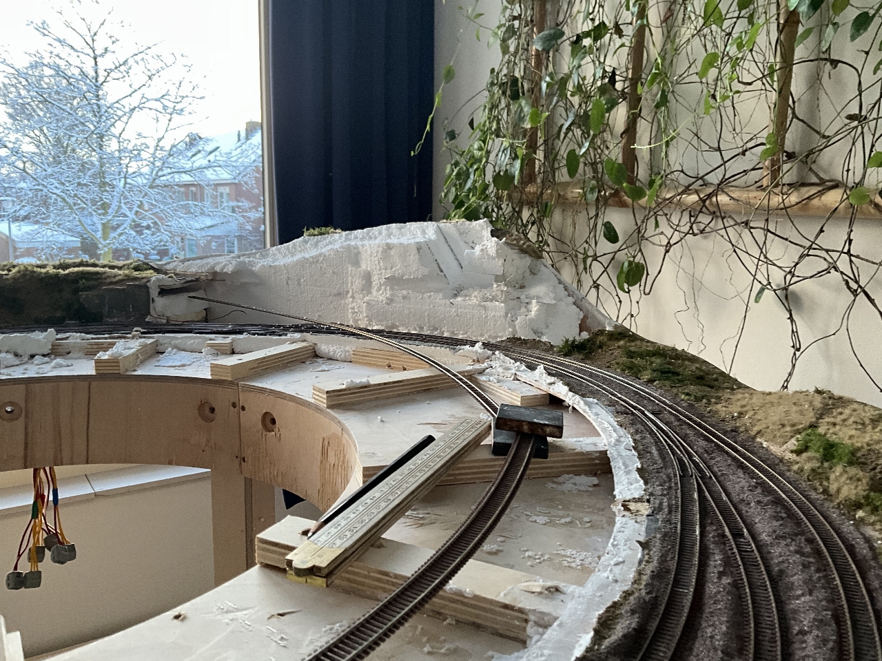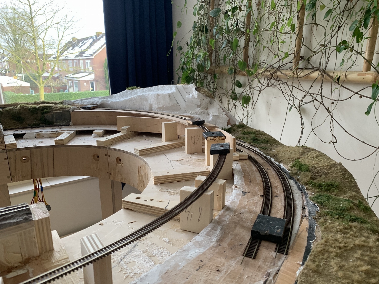 Een voorlopige proefopstelling. Omdat ik alles zoveel mogelijk in het zicht wil hebben, heb ik geprobeerd om in die hoek waar het spoor het dubbelspoor kruist, een "betonconstructie" te maken.