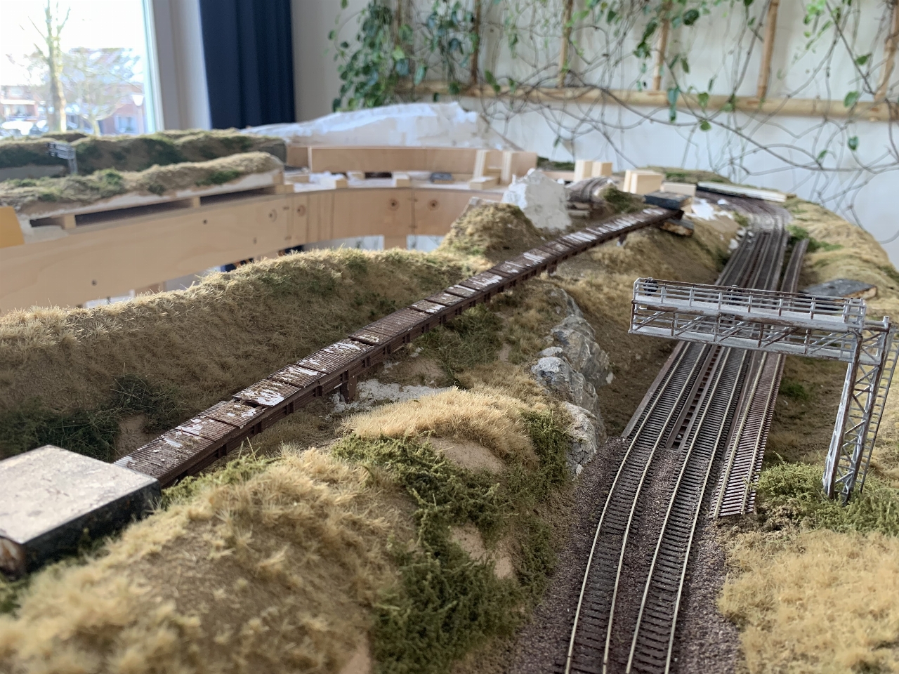 Nog wat foto's. De spoorbrug heb ik weten los te maken zonder noemenswaardige schade. Het restant met het bruggenhoofd blijft. De ligging van de brug wordt verlegd naar de voorkant van de module. Vandaar gaat het spoor via een brug naar het rivierlandschap.