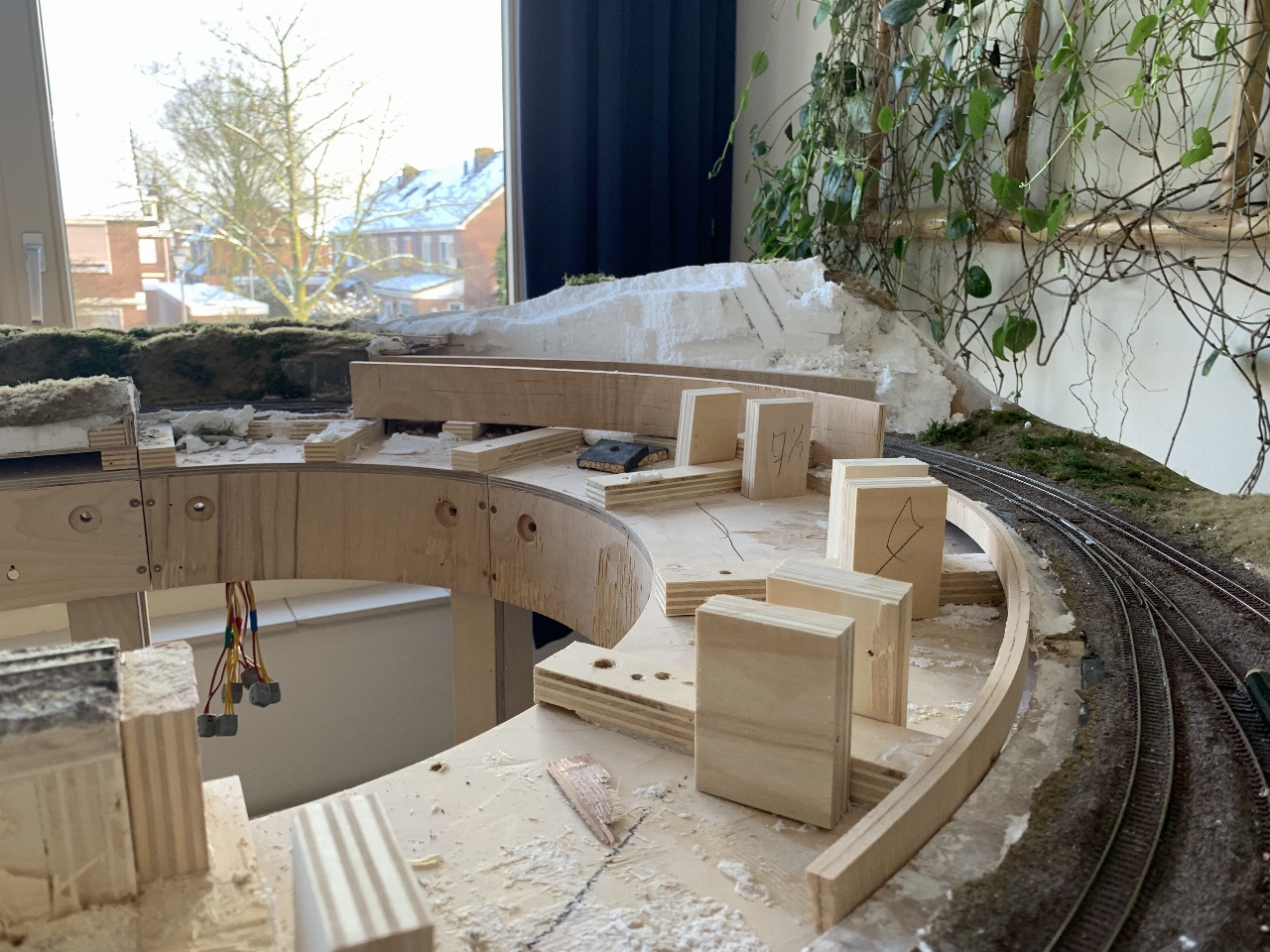 Het blijft tobben. Ook de andere, ronde module gaf de nodige problemen. Te krappe bogen, niet sluitende overgangen tussen railstukken ... Technieken worden weerbarstiger als je ze daadwerkelijk gaat toepassen. In theorie klopt altijd alles ;)  Ligt het aan mijn onhandigheid of ongeduld om in het laatste deel van de bouw alles snel af te raffelen? Vaak gaan dingen wel goed en ziet het er prachtig uit.
