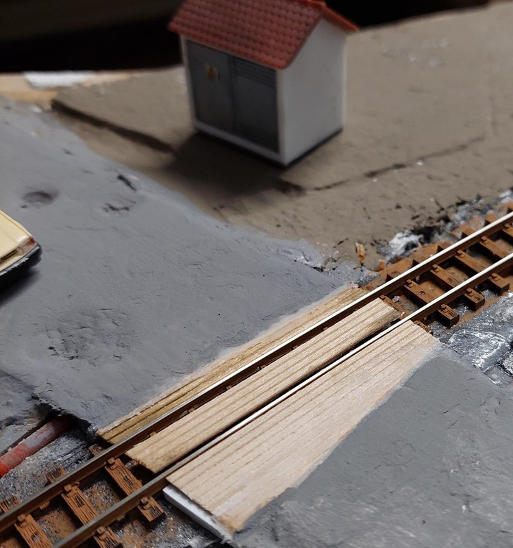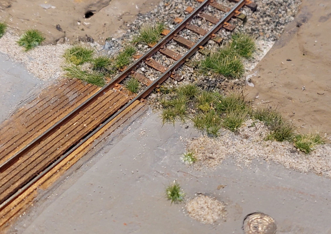 een klein stukje rails werd als test begrint. Ook het vlakke perrongedeelte kreeg een dun laagje fijn zand als ondergrond.