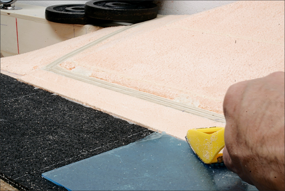 Om de juiste hoogte van de vloer van de groeve te gaan bepalen is eerst het rubber voor de zichtbare sporen op C gelegd. In totaal zijn 2 lagen van 3mm dik rubber verlijmd. Precies op de segmentengrens met B is een latje geschroefd dat als aanslag voor de stukken rubber dient. Voor het lijmen is de plaat eerst geschuurd zodat deze volledig vlak is.