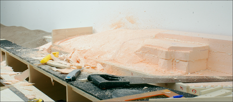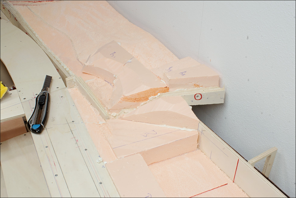 In de bocht onder de spoorlijn hoort een duiker te komen. Op die plek heb ik een uitsparing gemaakt. Het XPS wordt verder in vorm gesneden en geraspt, en de rand van de baan wordt gezaagd.