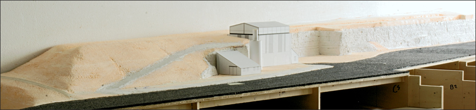 Een deel van de groeve met de gebouwen staan op een losse bak. Dat stuk moet op een of andere manier vastgezet worden aan het vaste gedeelte van de baan. Het uit en in de baan schuiven na het gipswerk is geen probleem.