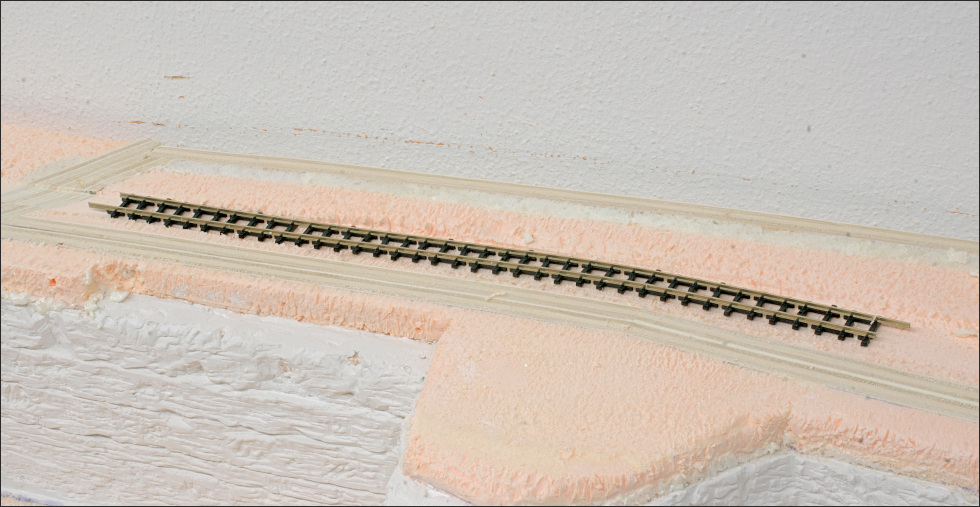 De precieze plek van de wissels (rechts) is nu bekend, en dan kan het laatste stukje rotswand worden gemaakt. Daar hoort ook weer een bekende bak voor het landschap boven de achterste verdekte rails bij. Enfin, het is het bekende systeem.