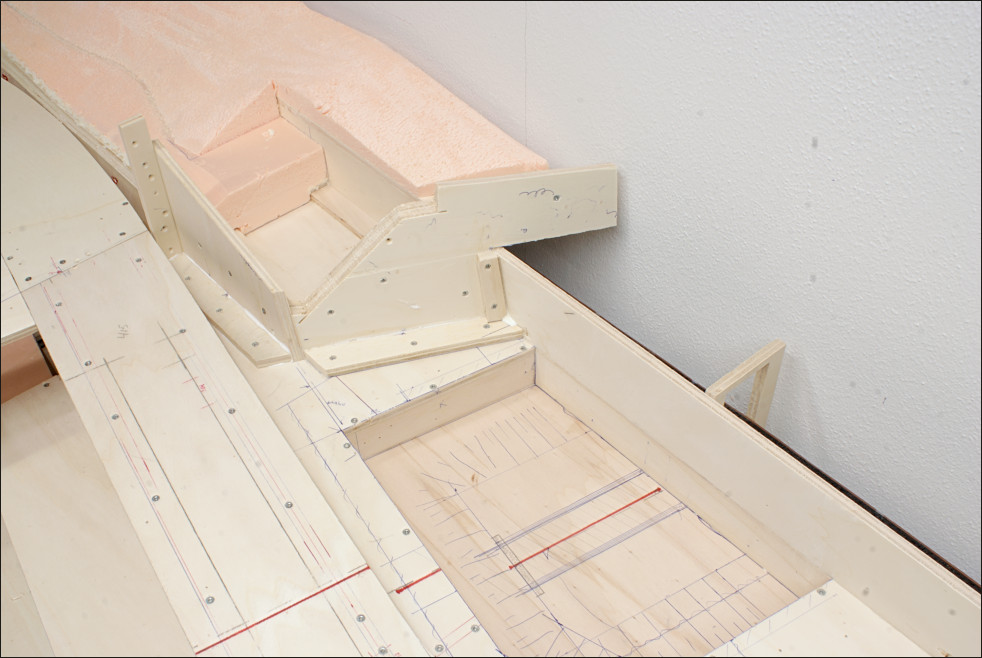 Op het raamwerk komt een bakje, en de voorkant wordt dichtgemaakt. Tegen het plaatmateriaal aan de voorzijde wordt een laag XPS bevestigd wat later de mergelwand zal worden.