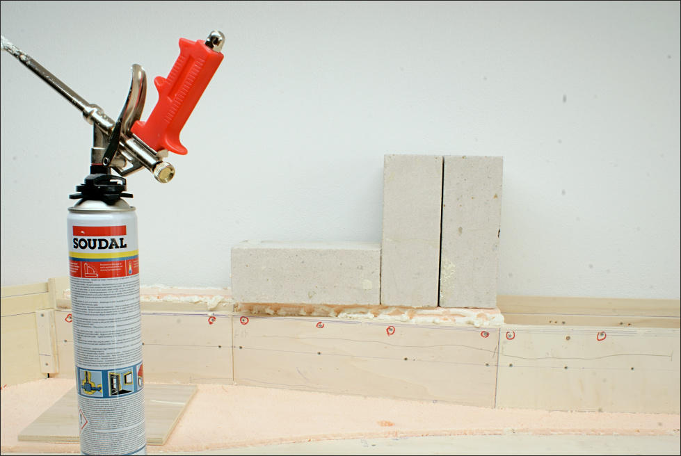 Dan is het een kwestie van alle boutjes monteren en de tussenliggende ruimte weer opvullen met XPS. En vervolgens een laag XPS eroverheen lijmen en gelijk maken met de hoogte van de dwarsliggers.