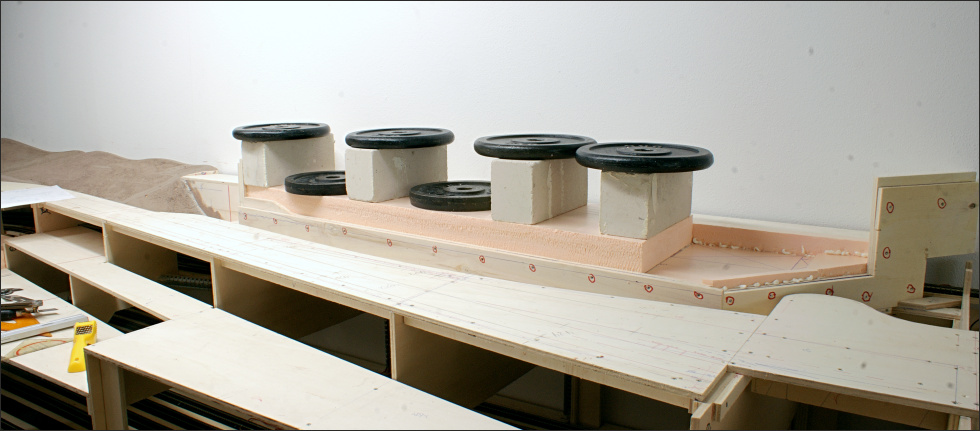 Voor de rest is de bouwwijze weer gelijk: eerst de buitenkant op de vaste baan maken, dan de bodem en randen van de bak maken, en dan opvullen met XPS. En schroefjes aantekenen zodat er straks geen enkele vergeten wordt.