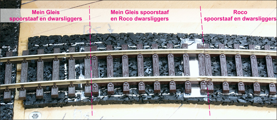 Dat ziet er zo uit. De bielzen van het middenstuk zijn een deel van een vaste Rocoline bocht. Het profiel van de Weinert rails is lager dan de Rocoline rails, daarom moeten aan de binnenzijde van het middenstuk nog de schroefkopjes van de railbevestiging worden weggesneden anders lopen de NEM flenzen aan. Het verschil in hoogte is opgevangen met een stripje kunststof.