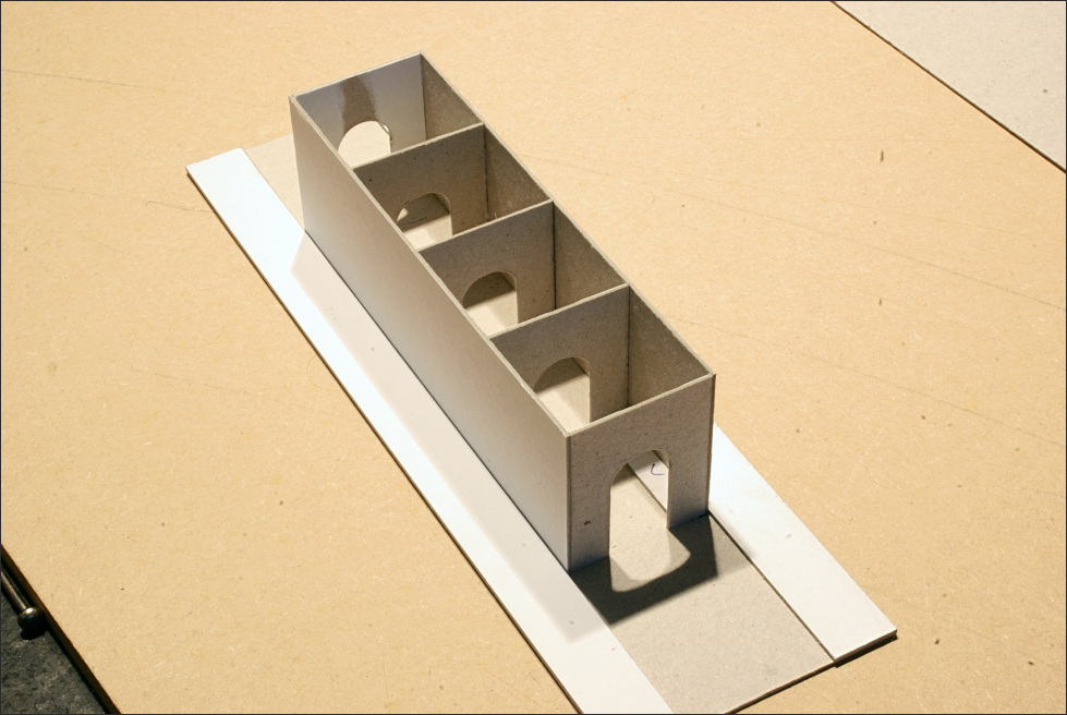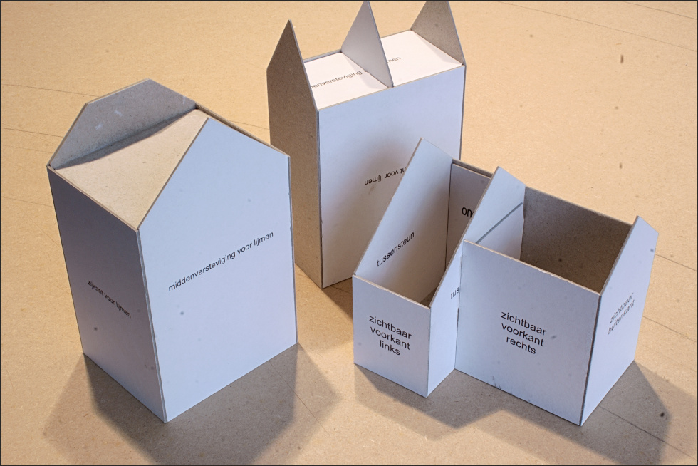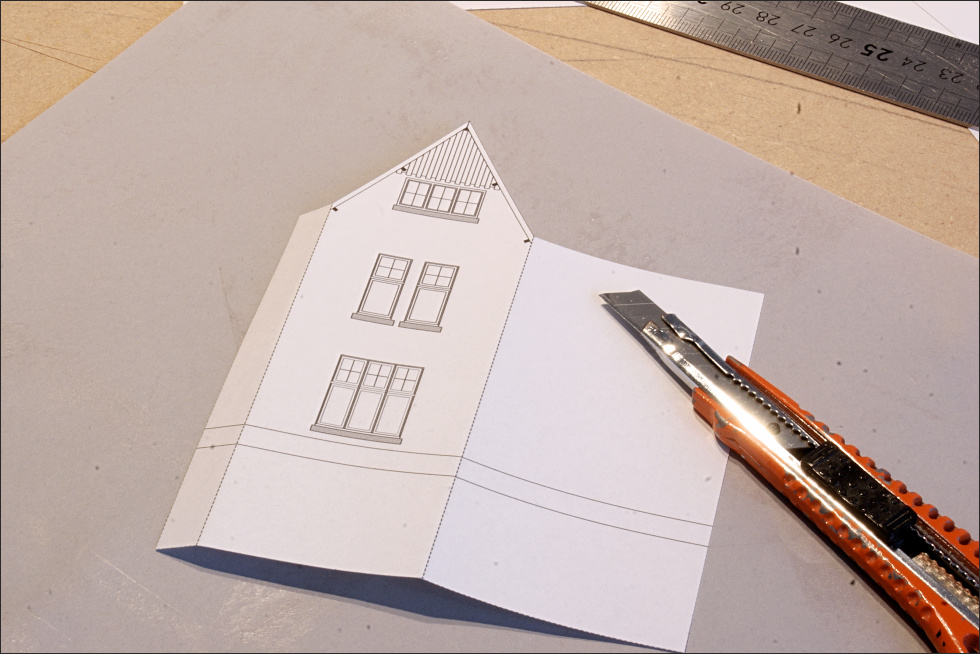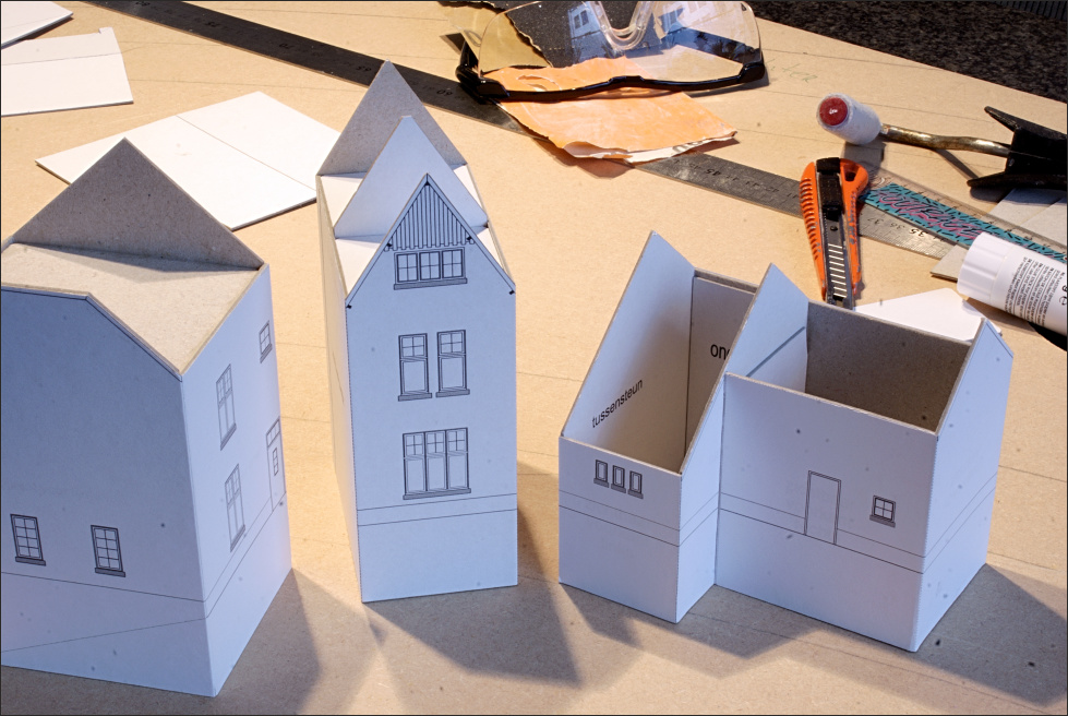 Bij karton ga je de hoeken niet schuren, maar eerder dekkend tegen elkaar zetten. Door op de dekkende gevel een gaatje te branden door het karton, krijg je daar ook de horizontale lijntjes die je in de zijgevel moet zien. Het wordt wel iets moeilijker om het verband dan logisch om de hoek te laten lopen omdat je de muren dekkend tegen elkaar zet. Maar als je dat goed ontwerpt is dat net de plek waar een regenafvoer moet komen en dan is de naad ook weer weggestopt.