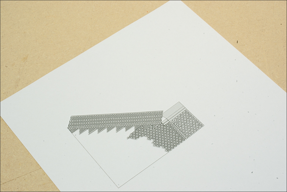 Het is hoe dan ook een kunstig werkje, al lijkt het zo simpel. Voor de afdruk van de steunmuur had ik al een gedetailleerde tekening gemaakt zodat ik het papier zodanig kon vouwen dat de bakstenen op de hoeken daadwerkelijk passen.