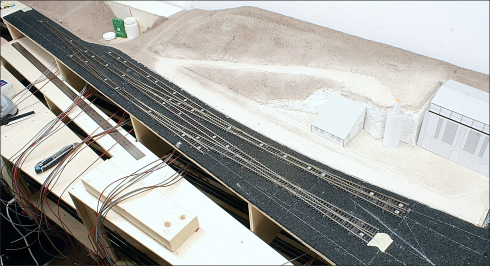 Na het uittekenen van de hartlijnen op het rubbergranulaat zijn de rails gelegd. De wissels van Mein Gleis zijn enigszins flexibel. Om alles mooi strak te leggen heb ik een stalen liniaal gebruikt.