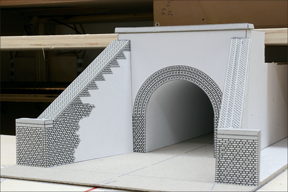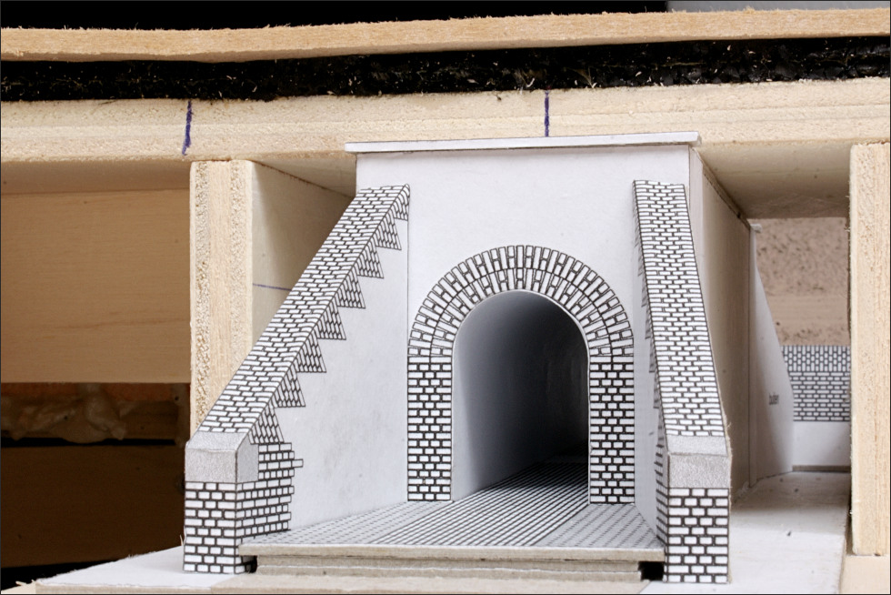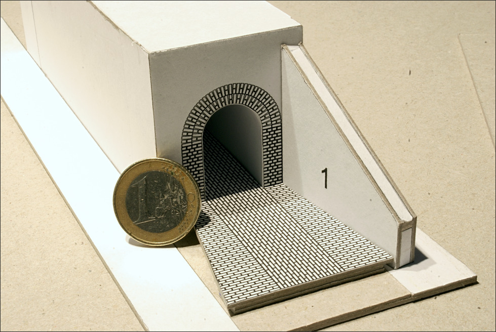 Ik vraag mij trouwens af op welke manier ik de definitieve versie zo'n duiker of tunnel het best kan maken? Het metselwerk van de steunmuren is complexer dan het op het eerste oog lijkt. Er zit geen nagenoeg geen rechte hoek in. Is dit iets voor een 3D-printer, of lasersnijder? Beide heb ik (nog) niet overigens.