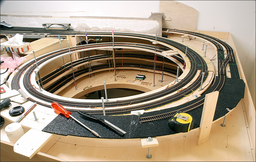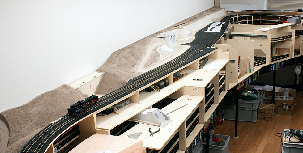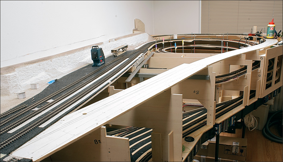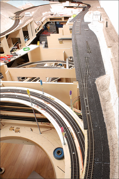 En dan volgt de aansluiting op de helix, met Rocoline R5 en R6 bochten, richting schaduwstation. Hier gaat de rails van Mein Gleis over op Rocoline in een bocht.