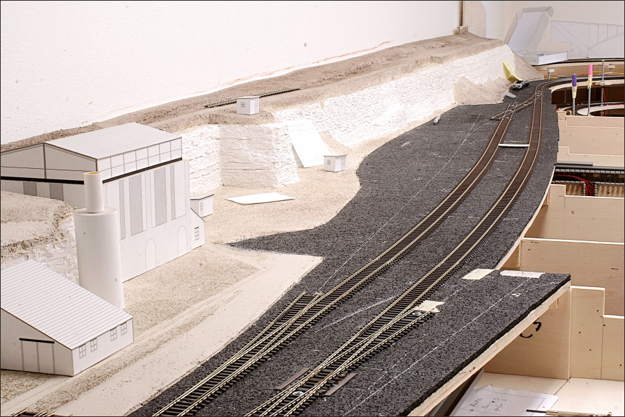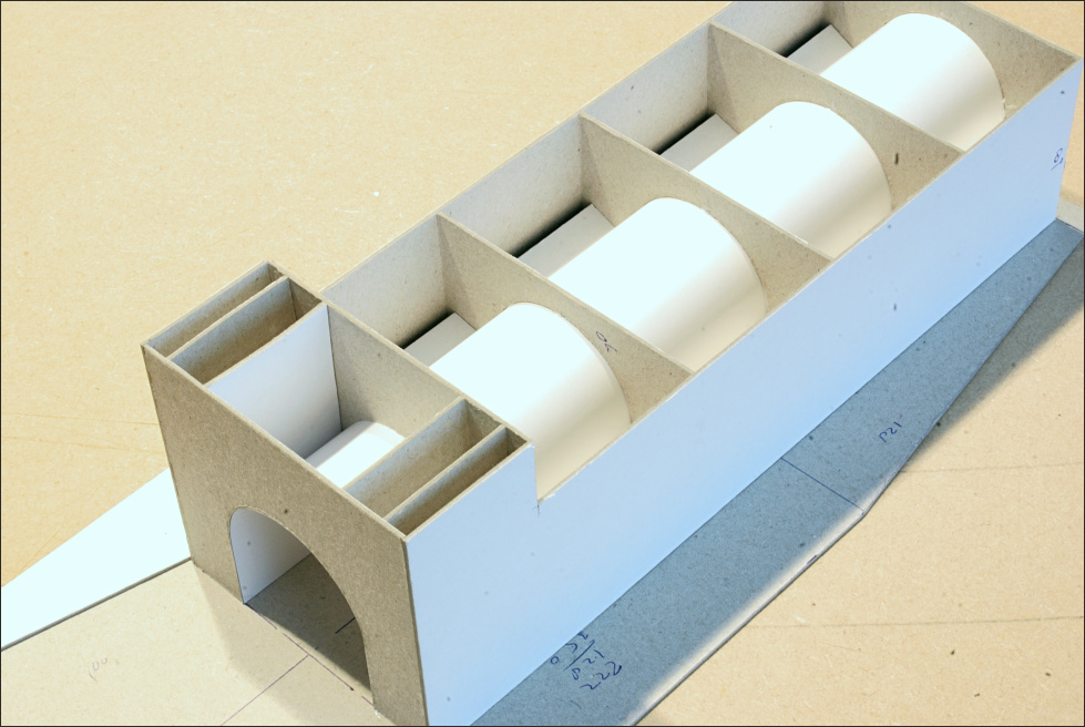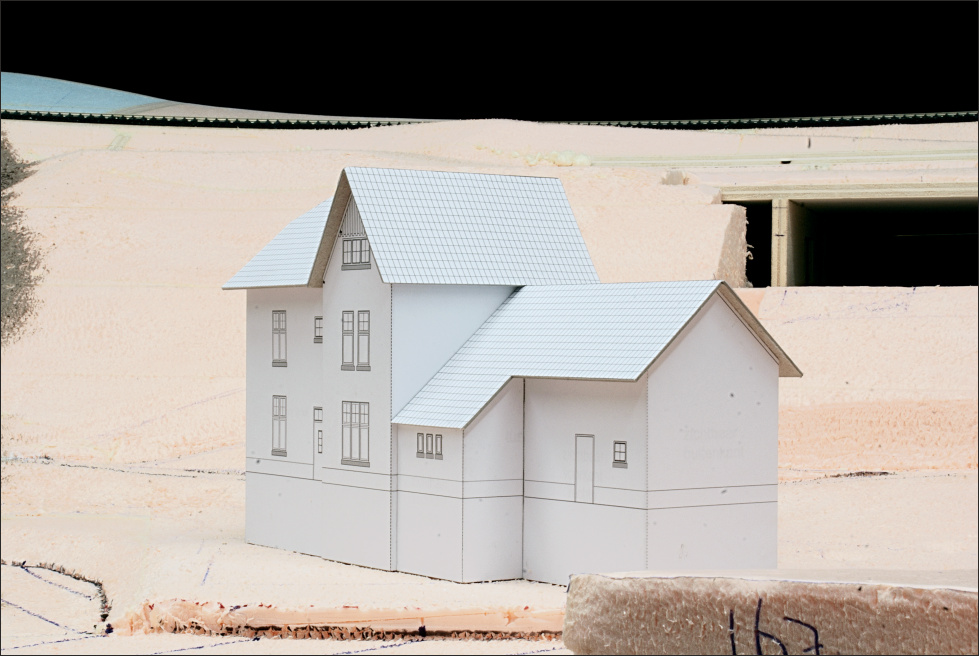 De duiker en de tunnel onder de spoorlijn, en een voormalig pension langs de spoorlijn, zijn gemaakt van karton. Het zijn eenvoudige modellen die ik voorlopig op de baan zet. Naderhand moeten ze worden vervangend door definitieve gedetailleerd uitgevoerde bouwwerken.