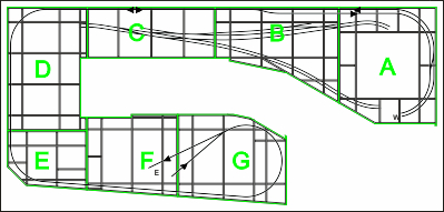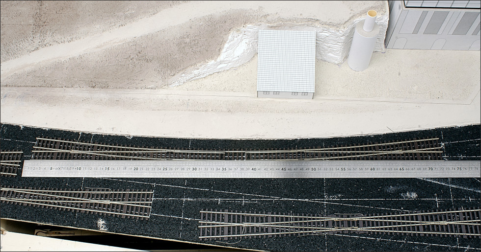 De kruising ligt op segment-B, en het voorste wissel ligt op A. Bij de overgang van A naar B zijn de spoorstaven weer op schroefjes gesoldeerd en vervolgens doorgezaagd.