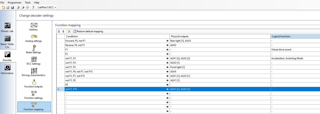 Nog een bijzonderheid, ik zie bij zowel F1 reverse als F5 een AUX8 staan toegewezen staan maar een PLUX22 heeft geen pin voor AUX8 maar alleen een soldeerpad, dit lijkt dus een foute toewijzing of er is een losse draad gesoldeerd aan soldeerpad van AUX8 (AUX8 wordt overigens niet genoemd in de handleiding van Roco 70861, dus een foute toewijzing lijkt aannemelijker)